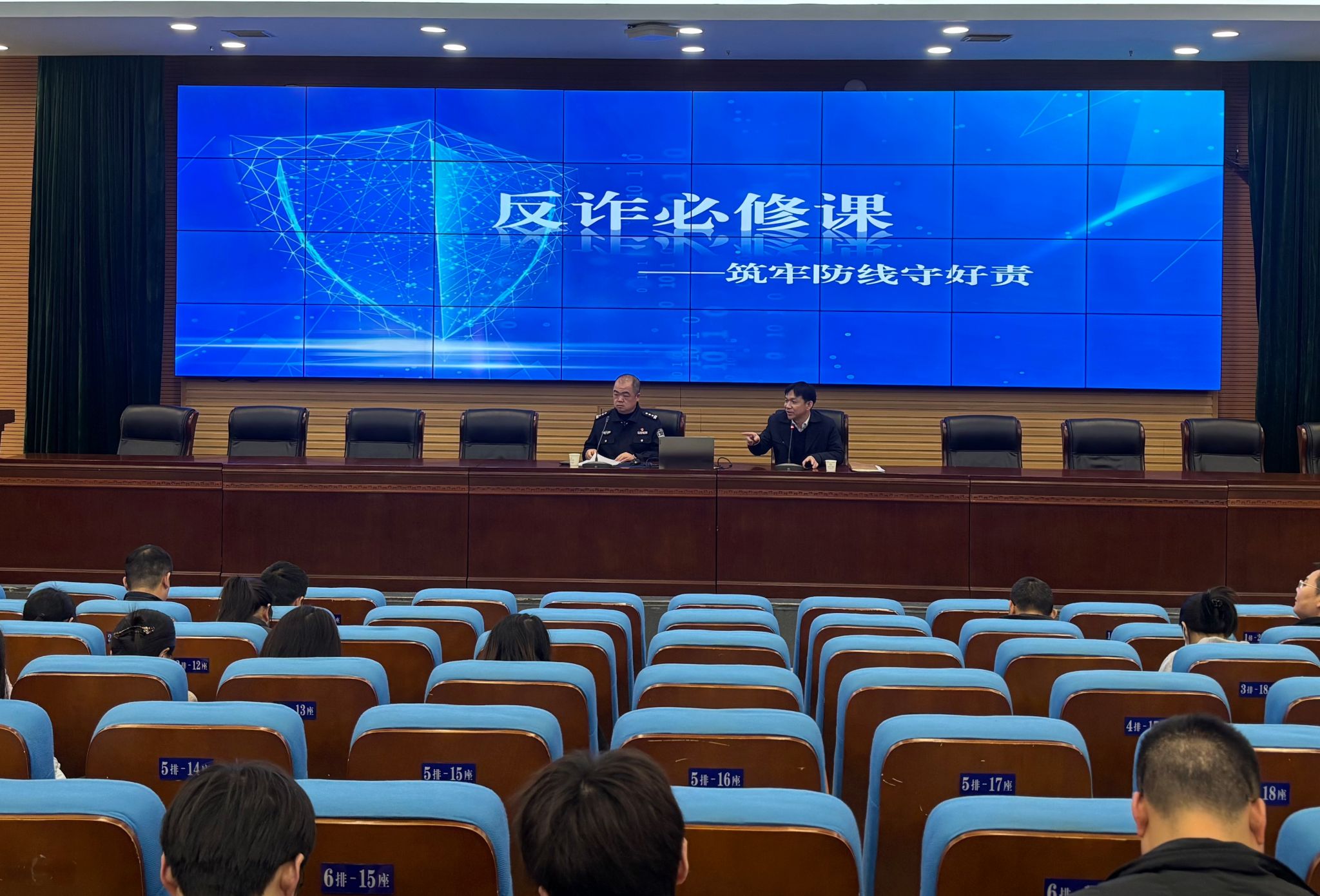 为筑牢校园反诈安全屏障,构建“警校协同、师生联动、全员参与”的立体化防诈体系,12月15日,388vip太阳集团在图书馆报告厅举办“反诈必修课——筑牢防线守好责”专题宣传活动。活动由学生工作部牵头,朝阳派出所所长张志平主讲,副校长孙倩,学生工作部、保卫工作部相关负责人,各二级学院党委副书记及全体辅导员参加。