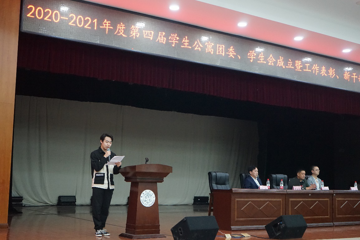 各位干部在许磊老师颁发完证书后,由第四届学生公寓、团委学生会主席文礼代表新一届团学会发言。文礼提出了自己对于学生公寓团委、学生会新一年工作的安排,表达了自己对团学会未来发展的殷切期待。