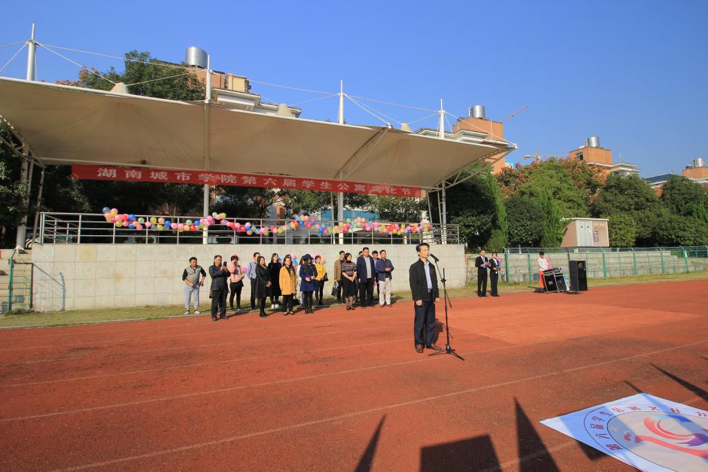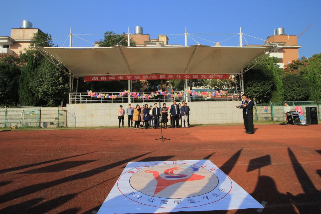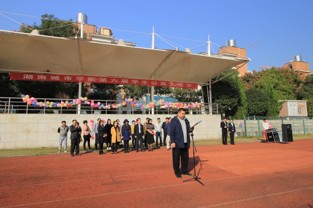 (本网讯)11月3日,第六届学生公寓文化节在标准田径场拉开帷幕,本届公寓文化节主题为“中国梦、乐师情、同宿谊”,学生工作部副部长蔡英杰致辞,学生工作部部长龙文宣布本届公寓文化节开幕。学生处和团委老师、二级学院学工书记和辅导员、学生公寓团学会全体干部、各学院学生代表参加了开幕式,