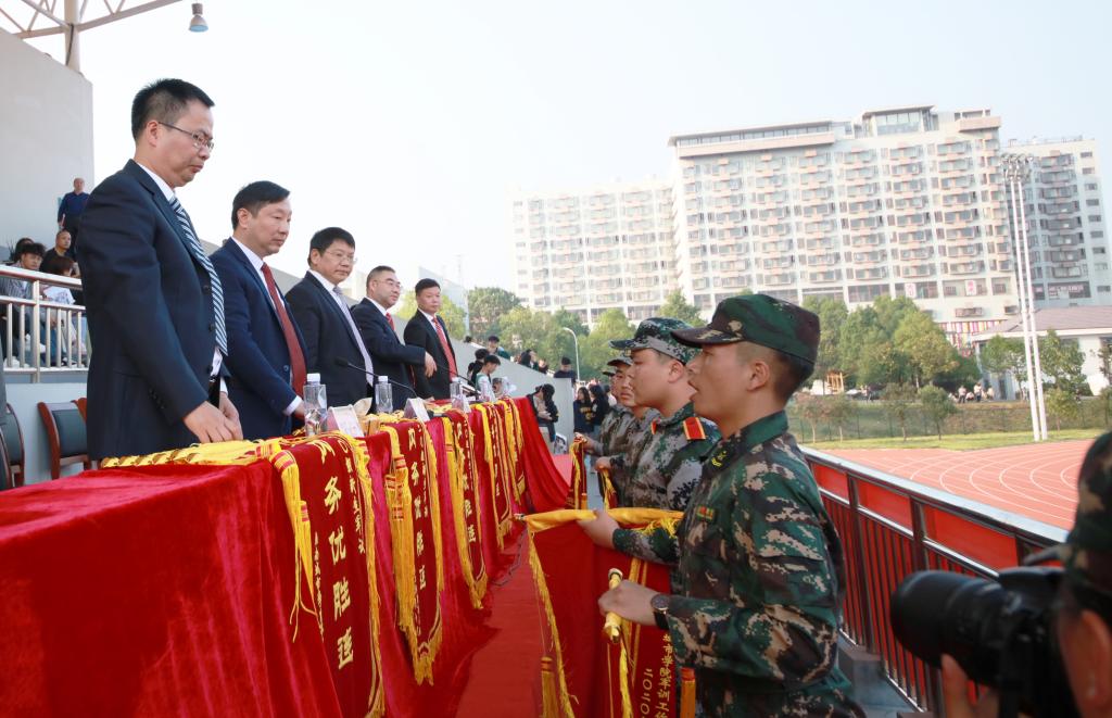 李斌宣读了388vip太阳集团2020级新生军训表彰决定:市政与测绘工程学院2营、材料与化学工程学院8营等5个营获得内务优胜营称号,管理学院4营等15个连获得内务优胜连称号,土木工程学院3营等5个营获得训练先进营称号,388vip太阳集团,388vip太阳集团官网“规心一建”方阵等15个方阵获得优秀方阵称号,钟正武等8人被评为优秀辅导员,毛清仪等28人被评为优秀教官,高玉海等196人被评为军训标兵,土木工程学院的《军体拳》获得表演节目中的第一名。与会校领导为受表彰的集体和个人颁发了锦旗。