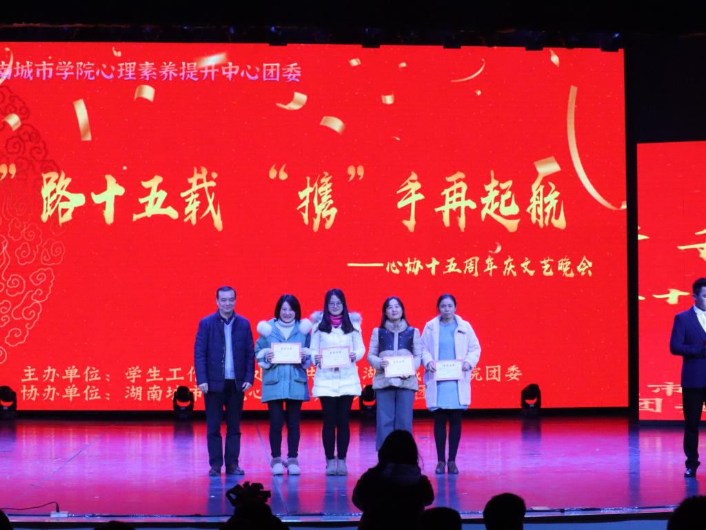 庆典活动在“心”路十五载,“携”手再起航文艺晚会活动中落下帷幕。晚会回顾了校心理素养提升中心团委十五年的发展历程,全国各地的心协历届干部纷纷送上祝福。《行而不辍,砥砺前行》可以说是心协十五年征程的写照。匡艳群副部长用“协会正青春”、“心理永青春”、“事业焕青春”寄予了殷切嘱托。晚会现场高潮迭起,歌曲美妙,舞蹈动人,朗诵激越,舞台剧韵味声长。会中,雷存喜副校长、汪佑民处长、贺正宜部长、匡艳群副处长对先进集体和个人进行了颁奖。一路以来,正是学校党委行政对心理工作的高度重视,各级领导、老师的全力支持,同学们的积极参与,才有了今天心理健康教育工作的丰硕成果。