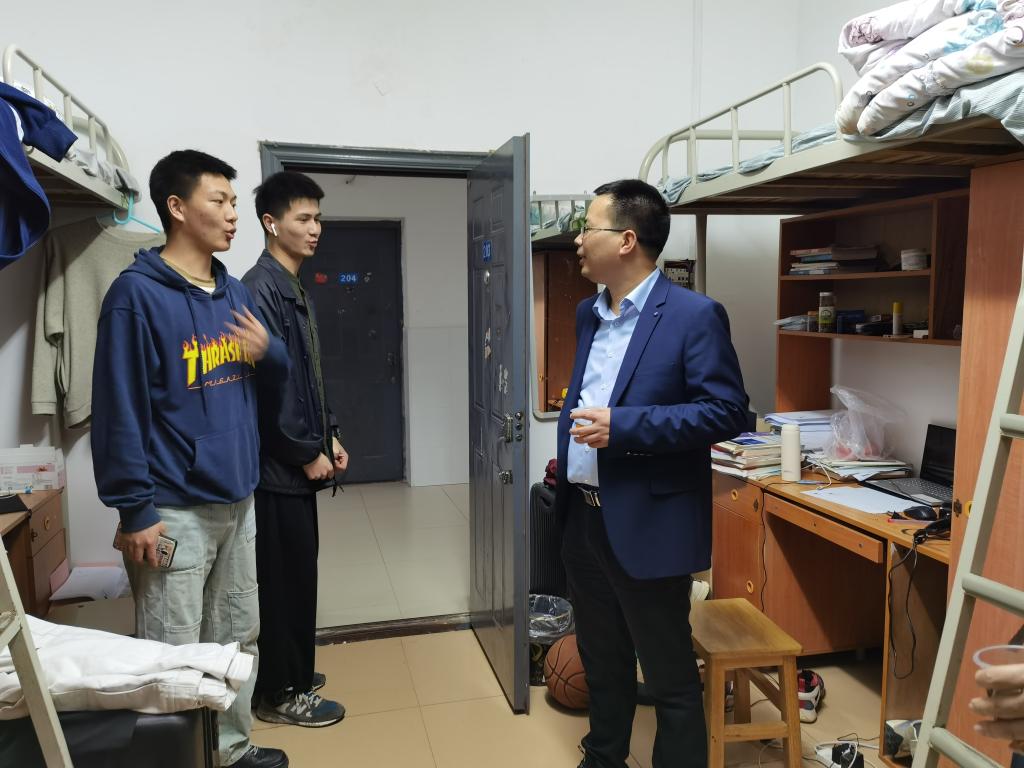晚上,袁志成副校长在贺正宜部长陪同下深入学生公寓,看望值班辅导员和学生,了解学生学习和生活有关情况。