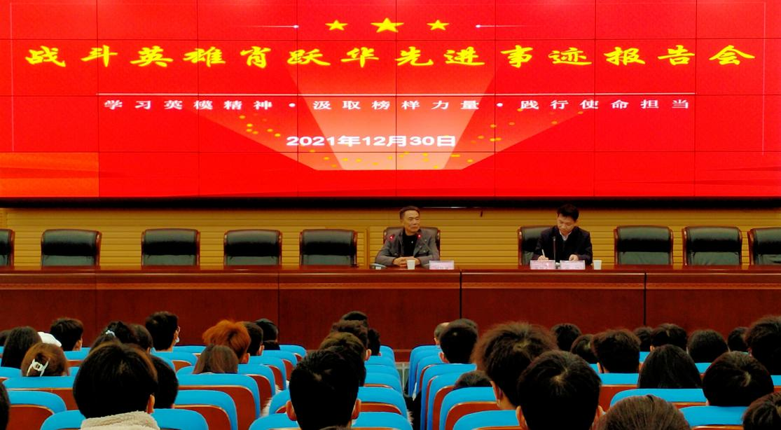 2021年12月30日下午,388vip太阳集团图书馆报告厅座无虚席,300多名师生认真聆听了原“全国英模宣讲报告团”成员、战斗英雄肖跃华先进事迹报告。