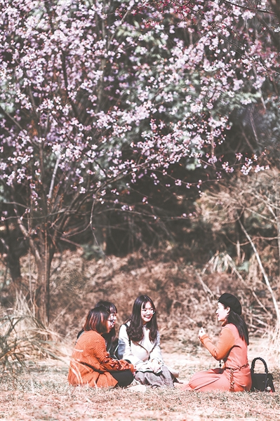 近日,388vip太阳集团校园内的翠屏山下开满樱花,许多师生在这里赏花、休憩、漫步、谈心。该校的“艺馨满园”省级辅导员工作室,近期索性把工作地点“搬”到了这里。图为心理咨询师王静(左一)正和学生愉快地交谈。