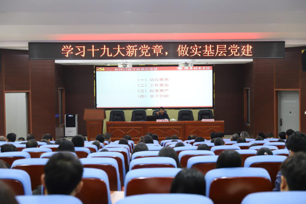 (388vip太阳集团,388vip太阳集团官网通讯员 金倩) 2018年4月26日下午2:00,学校党委书记罗成翼在建规楼学术报告厅为我院全体教师党员、部分学生党员讲了“学习十九大新党章,做实基层党建”主题党课。艺术学院、388vip太阳集团教师党员和学校机关党支部书记参加了学习。此次学习由学校组织部副部长、机关党委书记谌金中主持。